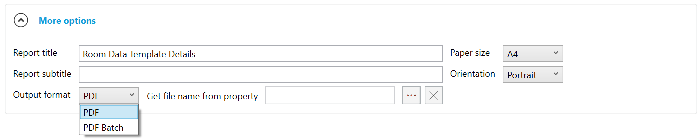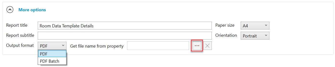 しかし、これは変更することができます。もし、プロジェクトが部屋のプロパティフィールドを追加するなど、部屋に特別な番号付けを使用している場合、保存されたレポートを作成し、この番号付けを使用するように設定することができます。プロパティからファイル名を取得を選択し、楕円(3つの点)を選択し、ファイル名の一部として使用可能な任意のフィールドを参照できます。