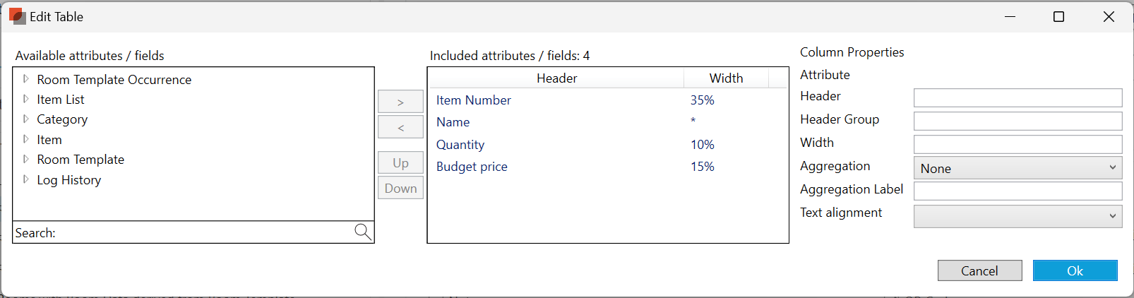 オカレンスでは、デフォルトで4つの列が以下の幅で表示されます:アイテム番号(35%), 名前(*), 数量(10%), 予算価格(15%)は、任意のオカレンス・フィールドを含むように調整することができます。* 印は、幅が定義されていないことを表し、幅が定義された列を使った後に、100%を構成するために残るものを表す。列を編集するには、このコンテンツの横にある “Edit (編集)”を選択します。