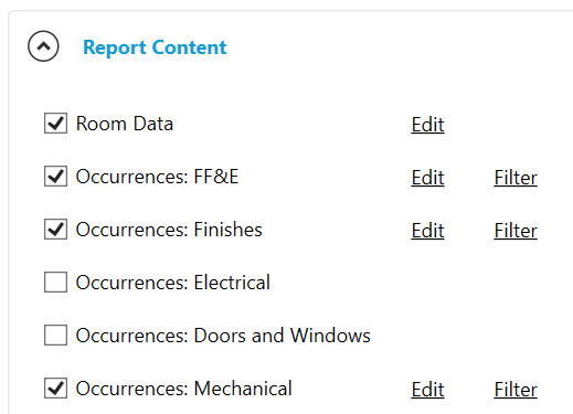 デフォルトでは、レポートには、部屋データ、オカレンス、コア プロパティ、標準エリア、グループ、分類、およびステータスが、含まれます。