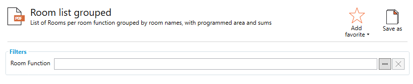 このレポートは、部屋名でグループ分けされた部屋機能ごとの部屋のリストで、プログラムされた面積と合計が表示されます。