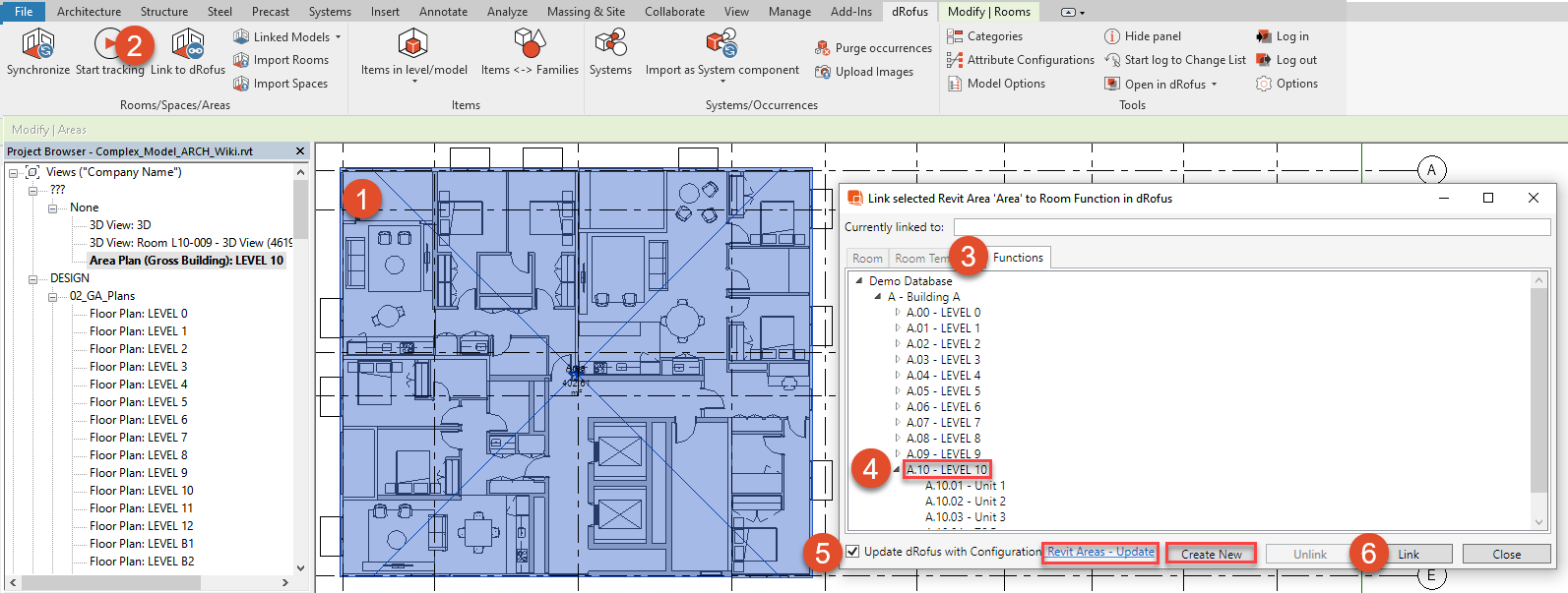 “dRofus構成を更新” チェックボックスをオンにするとアクティブなエリア属性構成 (図示したケースでは “Revitエリア-更新”)に従ってエリアと機能が同期されます。
