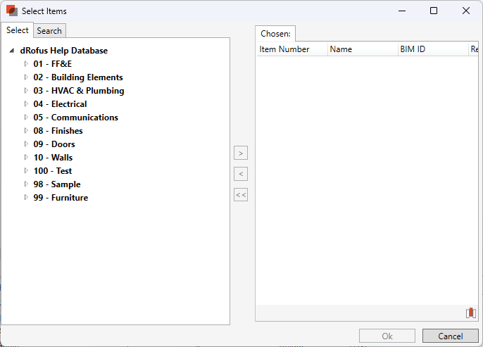 3. Select Item(s): Navigate or search for the Item you would add as a Sub Item. Double click on the Item or use the narrow [>] to add the Item.