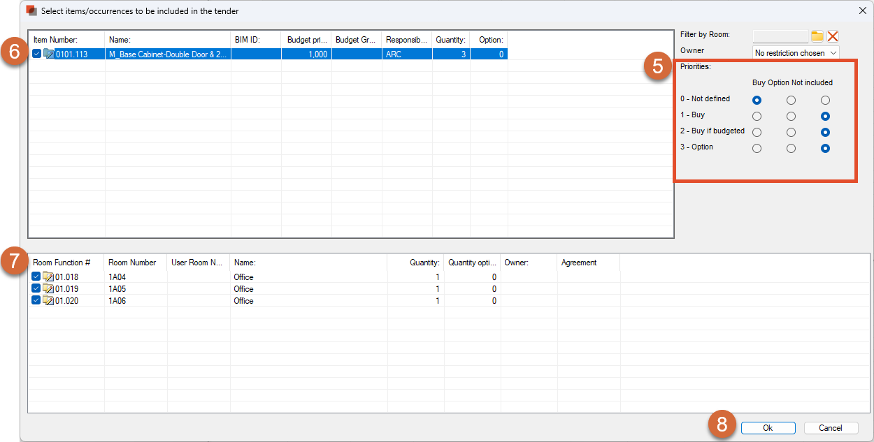 5. Select the Priorities group for the Items you would like to include in the tender and decide if you are going to buy the Item or obtain Item cost. Read more about Priorities: Step 1: Add Items to Procurement module