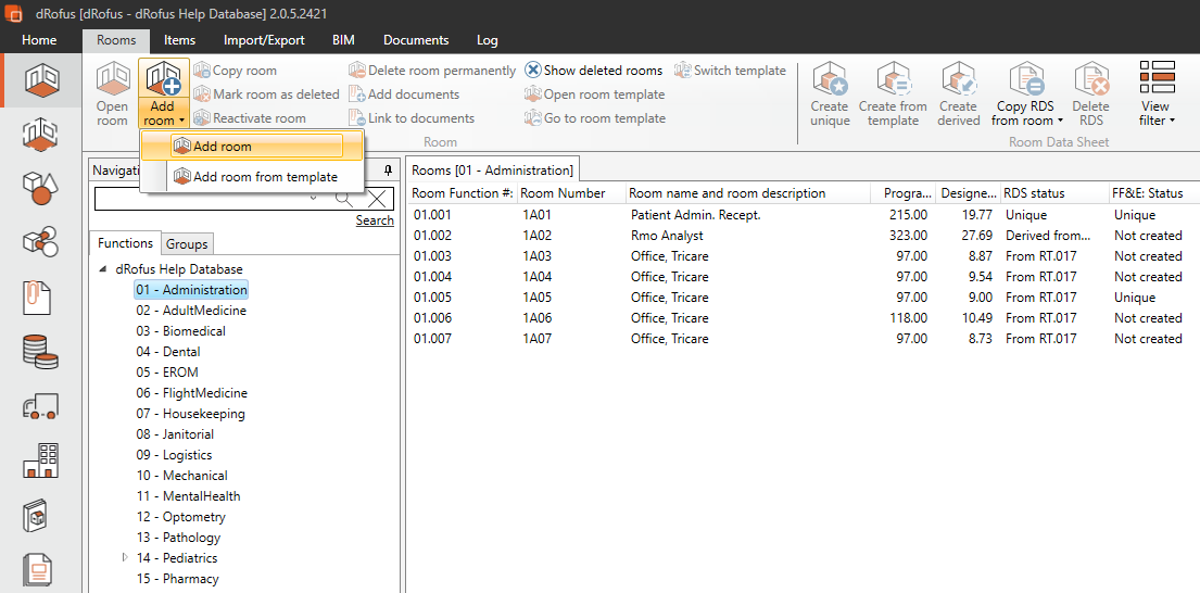 Select “Add Room from template” in the Ribbon menu. Window below will appear: