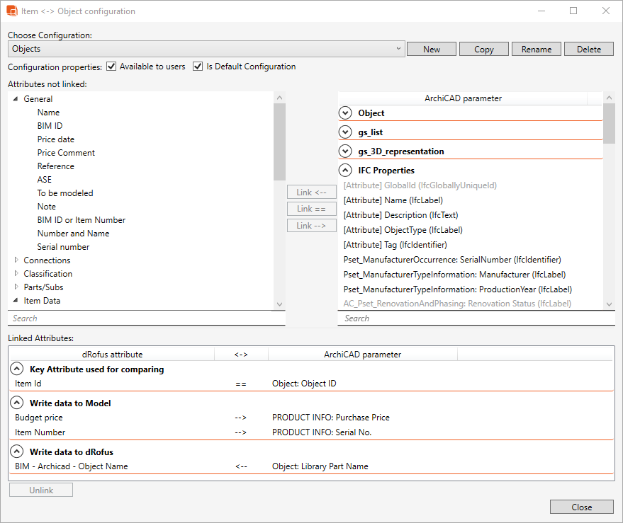 Write data to dRofus: Select a dRofus Attribute, then select an ArchiCAD parameter and then click on "Link <--". Next time the configuration is used for linking or synchronizing, the data flow direction will be from ArchiCAD to dRofus - i.e., values from the Objects' selected ArchiCAD parameter will be written in to the Items' selected dRofus attribute.