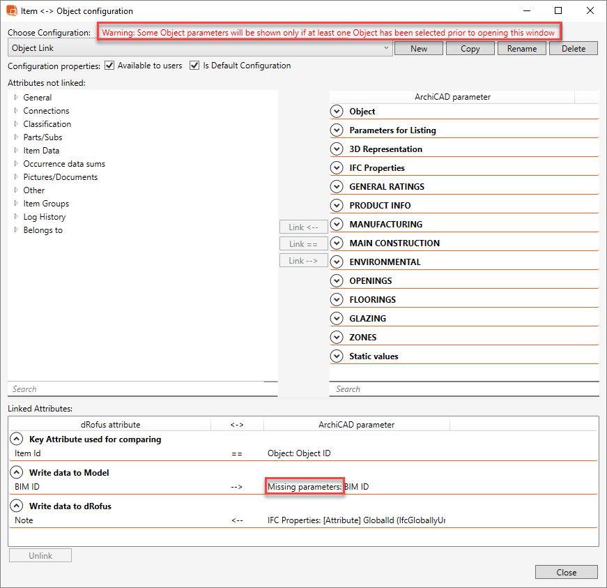 Only parameters from the Library Part of the currently selected Object will be available within the dialog. Additionally, IFC properties will not appear within the Object <-> Item Configuration Editor dialog, unless you select at least one Object prior to opening the dialog. This also applies prior to carrying out the Sync Objects with dRofus command.