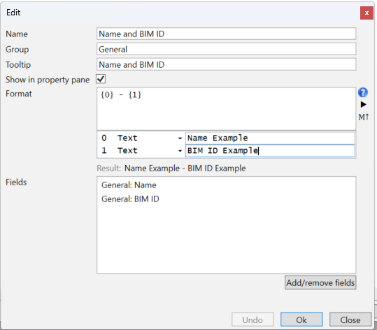 We have named the attribute "Name - BIM ID" and placed it in the 'General' group in the item property panel. We have typed in a Tooltip and included it in the property panel. We have added "Name" and "BIM ID" as fields and decided that the fields ({0} & {1}) should be combined with a hyphen (see the 'Composite text' option).