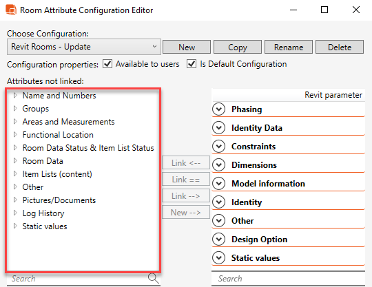 Within the top-left section of the Attribute Configuration Editor, the available dRofus attributes are categorized differently for each type of Configuration as follows: