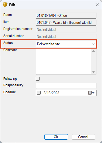 a. Opening the “Edit” window and select the status in the drop-down menu. Open window by either: