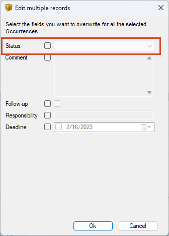 a. Opening the “Edit multiple records ” window and select the status in the drop-down menu. Open window by either: