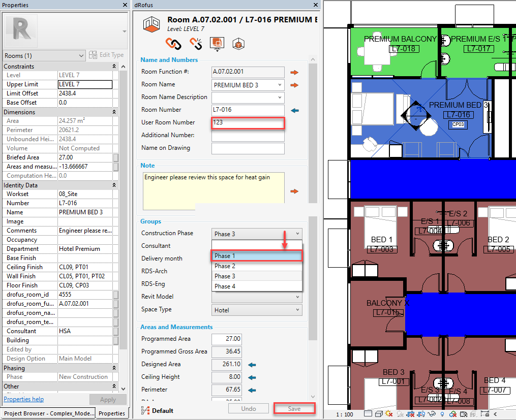 dRofus' User Room Number value (within the dRofus Panel) is changed from <blank> to "123" and Group Type - Construction Phase value is changed from "Phase 3 to "Phase 1" and then "Save" is clicked on: