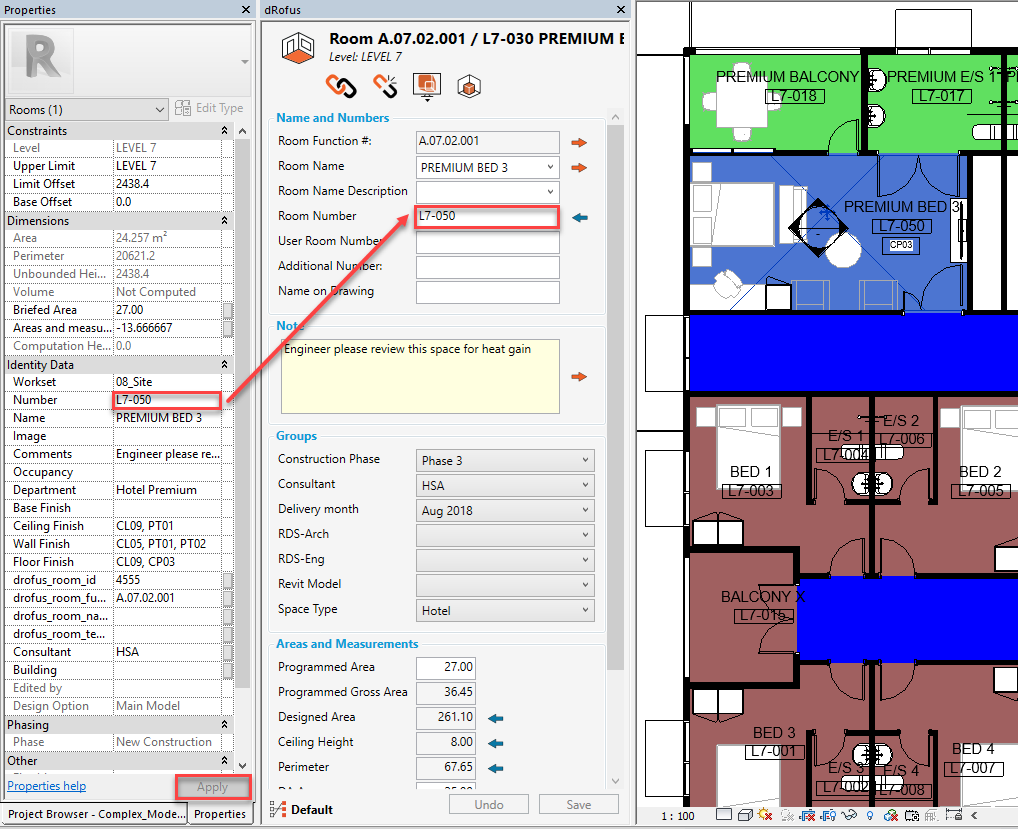 Example: Revit's Number value (within the Revit Properties Panel) is changed from "L7-030" to "L7-050" and then "Apply" is clicked on, the update will be made immediately within the corresponding dRofus attribute Room Number (within the dRofus Panel) as well: