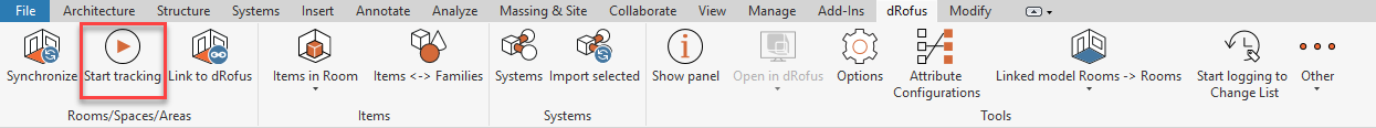 This does not necessarily mean that the value for dRofus attribute Room Number has actually changed within dRofus Client. In other words, those fields within the dRofus Panel that have blue arrows next to them simply displays the current values of their (mapped) Revit parameters, and not the actual values of the corresponding dRofus attributes. The only way to be certain about updating dRofus attributes within dRofus Client when updating values of the (mapped) Revit parameters within the Revit Properties Panel is by using a feature called "Auto Sync" - which can be engaged by clicking on the Start tracking button: