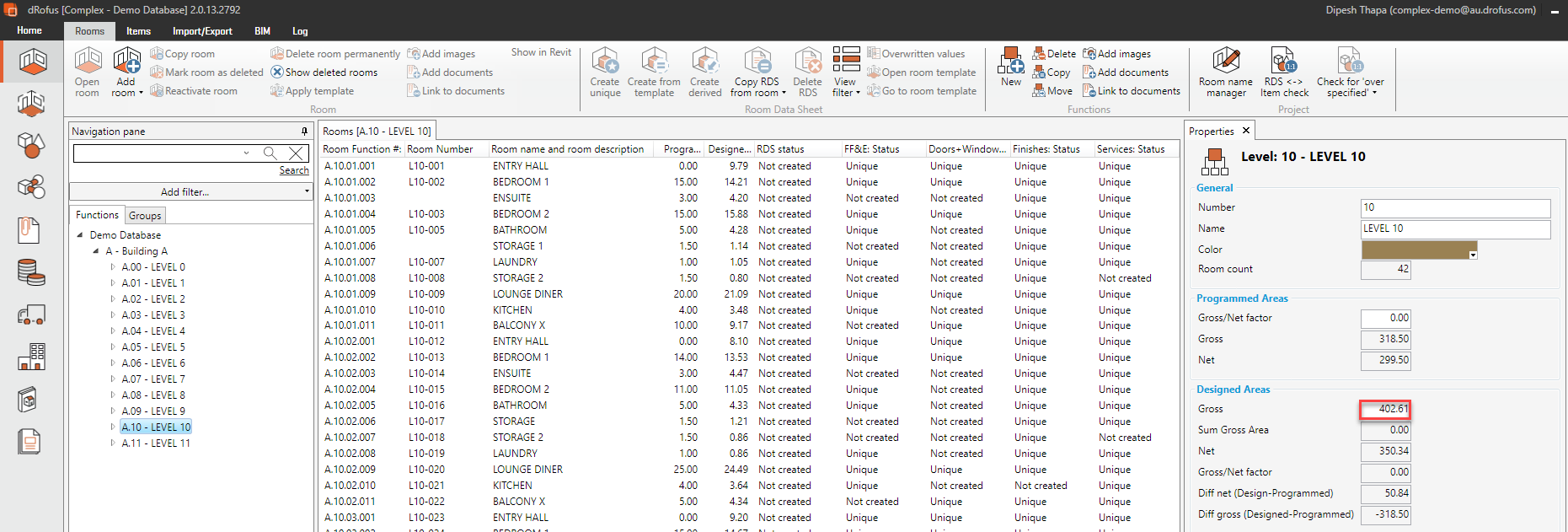 The value will then be displayed for the selected Function within dRofus in the Properties Panel under "Designed Areas: Gross" as highlighted below: