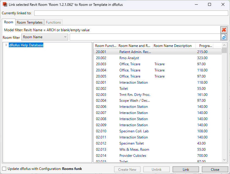 A dialog box will appear with all rooms in dRofus that are not linked with a room in Revit: