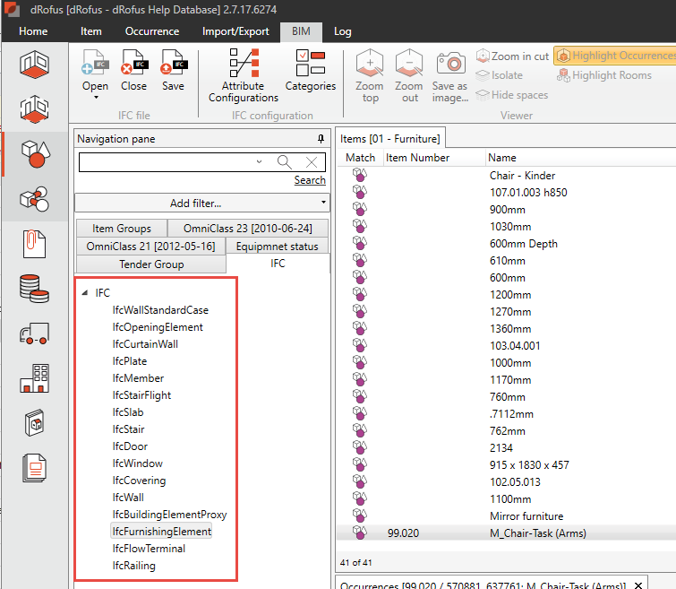 IFC displays IFC classes found in the connected IFC file. In the list to the right, items are found based on the current Item <-> IFC Item configuration. Navigate the Items by clicking on the IFC classes in the navigation pane.