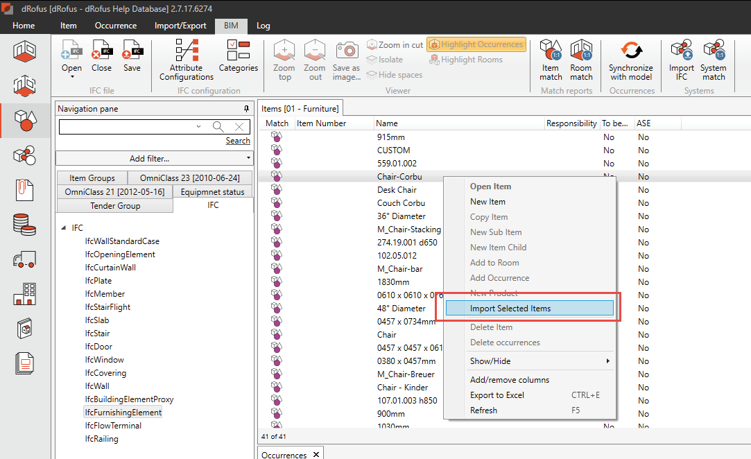 In order to import and synchronize occurrences from IFC, items must be established for the occurrences in the Item overview in dRofus. To create Items based on occurrences in the IFC file, you first need to connect to an IFC file. In the Item overview, you should now see a new tab called IFC among the Item groups, Statuses, and Classifications section connected to an IFC file. In the Item overview you should now see a new tab among the Item groups, Statuses and Classifications section, called IFC.