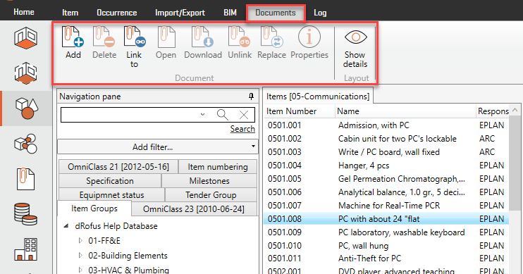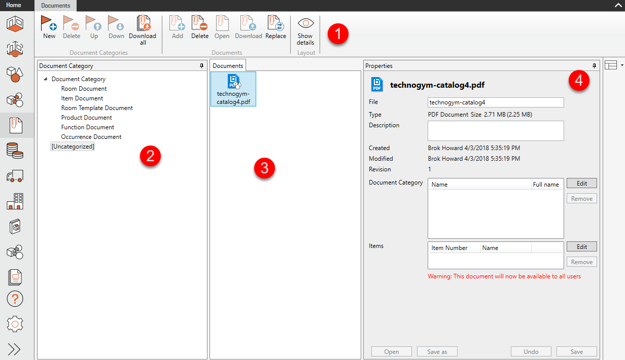 Document category: Browse the uploaded documents by document categories. If you have write access to items you can create, edit and delete document categories. There will always be one category named [Uncategorized] that shows all documents that have not been attached to a document category. You can also add new documents by choosing Add from the ribbon menu. Documents do not need to be attached to an item or a product.