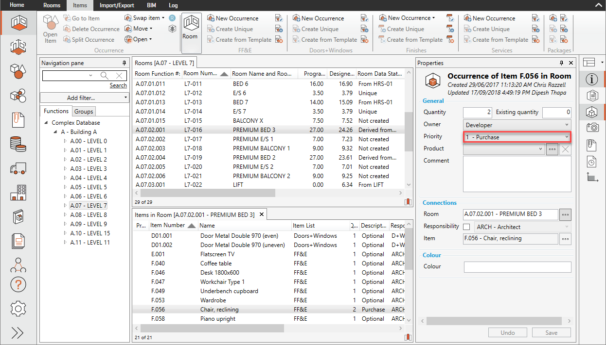 In the following example, if dRofus' Priority value is changed from "2 - Optional" to "1 - Purchase" and then "Save" is clicked on: