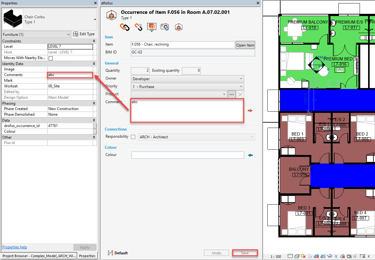 In the following example, if dRofus' Comment value is changed from <blank> to "abc" and then "Save" is clicked on, the update will be made immediately within the corresponding Revit parameter Comments as well: