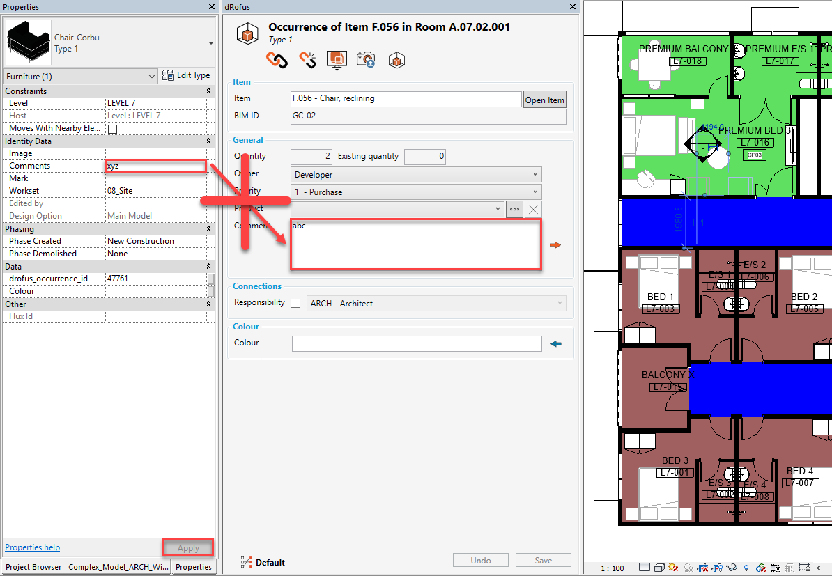 In the following example, if Revit's Comments value is changed from "abc" to "xyz" and then "Apply" is clicked on, the update will NOT be made within the corresponding dRofus attribute Comment as follows: