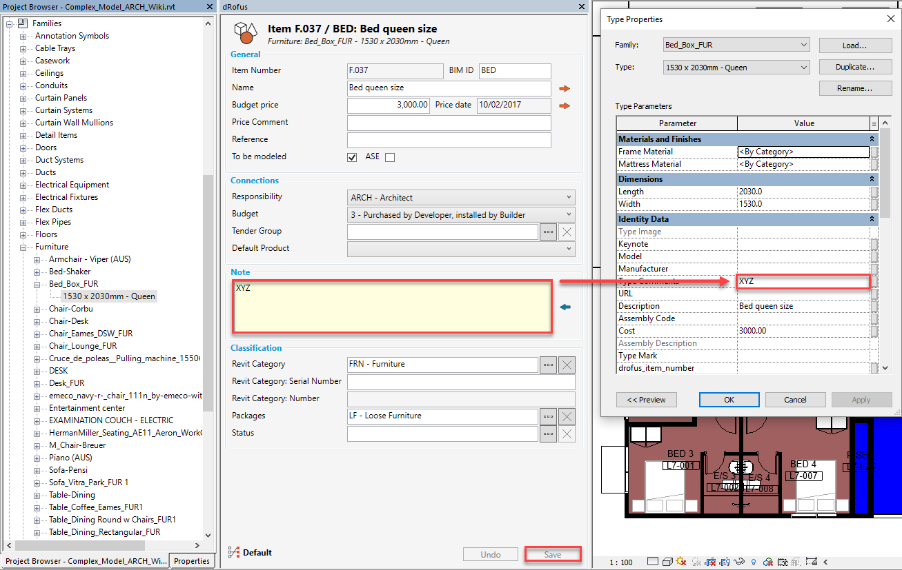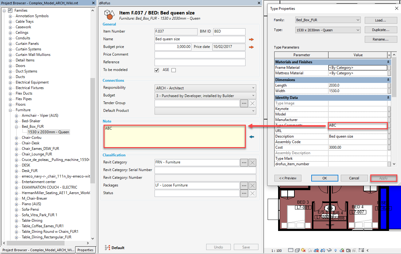 In the following example, if Revit's Type Comments value is changed from "XYZ" to "ABC" and then "Apply" is clicked on, the update will be made immediately within the corresponding dRofus attribute Note as well: