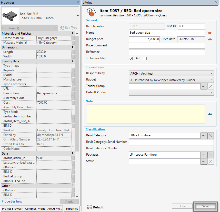 In the following example, if dRofus' Budget price value is changed from "3,000.00" to "5,000.00" and then "Save" is clicked on, the update will be made immediately within the corresponding Revit parameter Cost as well: