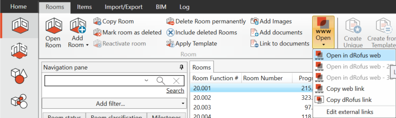 To find the address, accessing the web from the dRofus client is always possible. If you have selected a room, an item, or an occurrence, you will always have a choice at the top "open in dRofus web.” This will always send you to the correct web address.