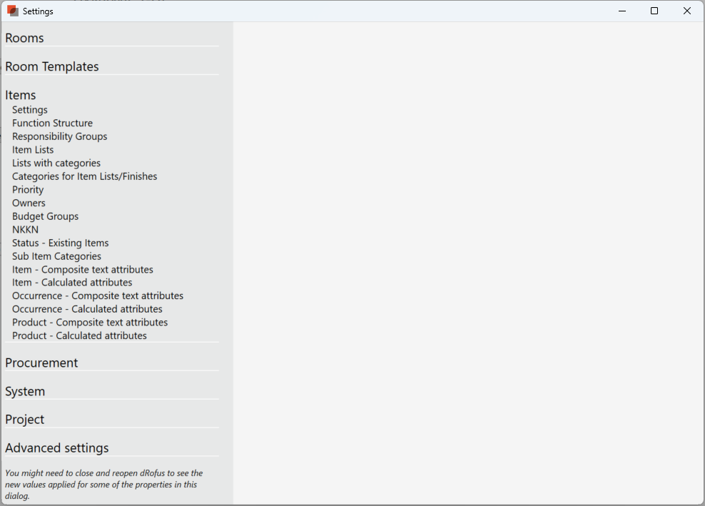 You will need Administration User access to the dRofus database to create calculated attributes. Select Settings at the bottom-left corner, then "Settings" (under Project and Database Administration), then "Items":