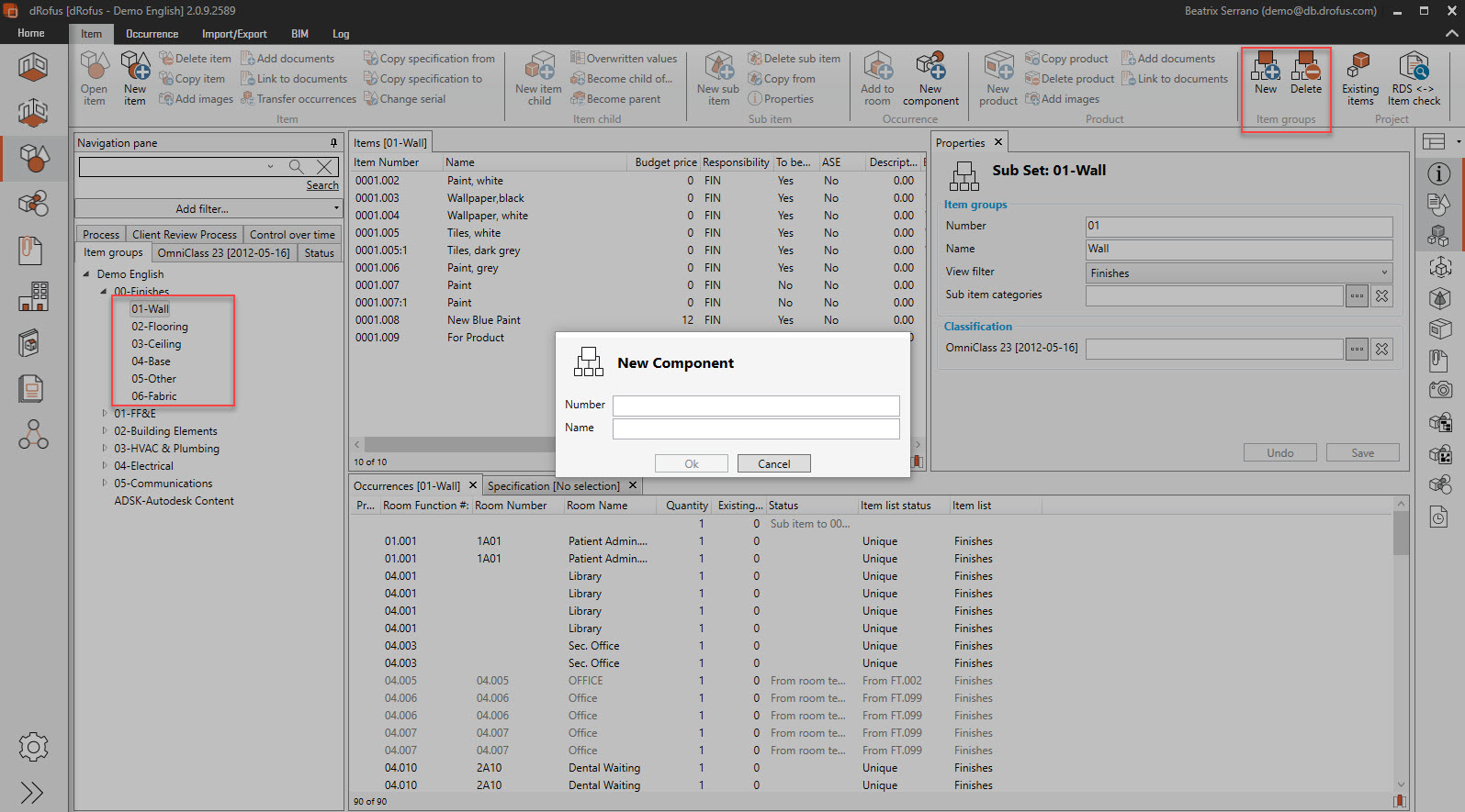 For instance "Finishes" → "Wall" and then a component level that you can add by clicking new on the right top corner of the item window.