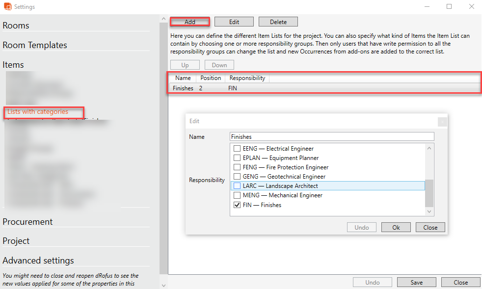 The illustration below shows the location of the Finishes List settings in the Settings Panel. To create a new Finishes List select "Add" and type in the name and select the relevant Responsibility Groups: