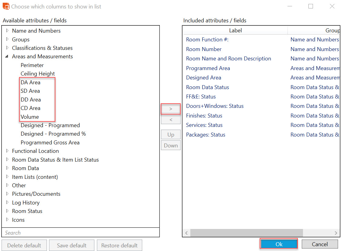 or right click and select "Add/ Remove Columns". Then choose the custom Room measurements under "Areas and measurements"