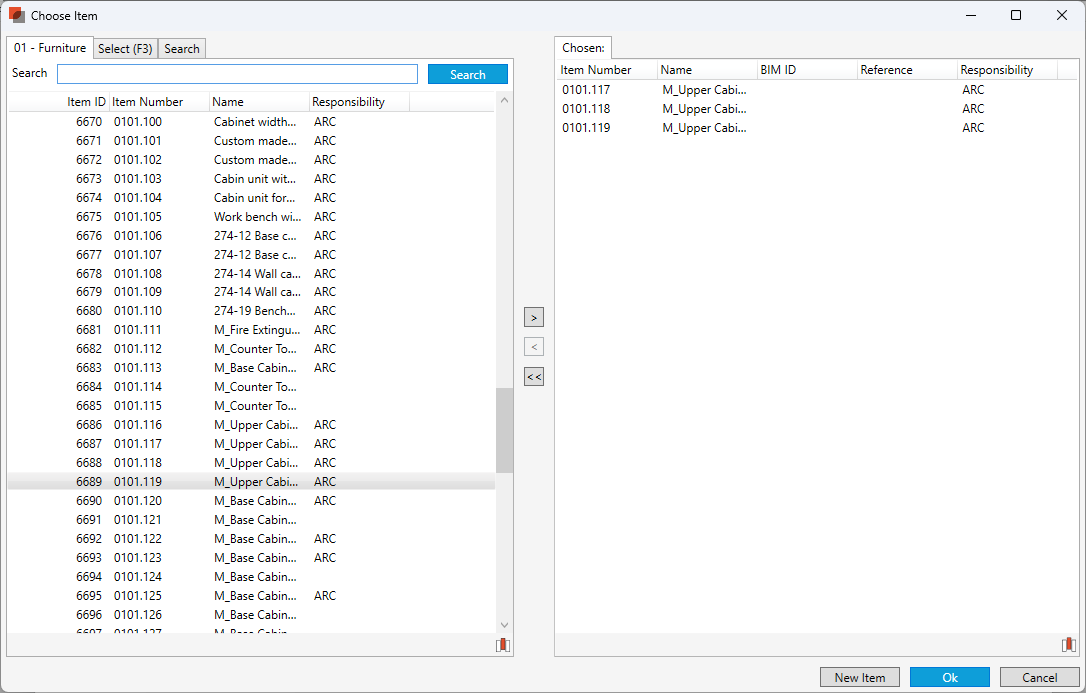 A window displaying Items that can be added to the list. It is possible to add several Items from the Item database at once. Items can be found by scrolling through the Item structure or searching by Item name or number. On the right-hand side of the screen is a list with the Item you want to add to the list. To move an Item from the left to the right, double-click on the Item. If you want to delete an Item from this list, double-click again on the Item you want to remove. Once you have selected all the Items you want to add, click on OK.