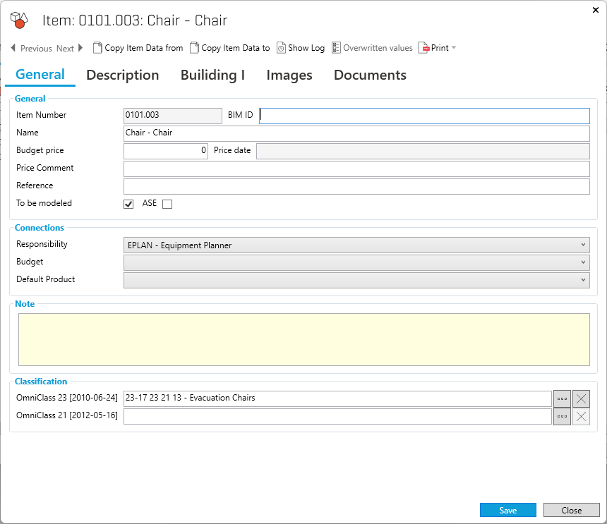 Displays any existing item linked to this occurrence (ref. chapter 12). Select one of these to open the component in question..