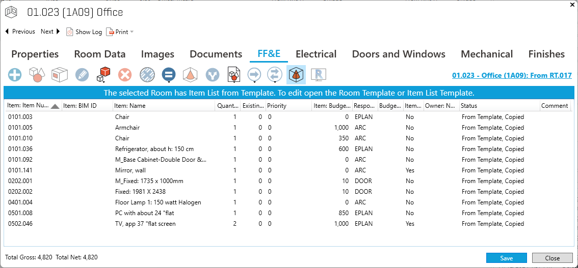 Next and Previous (ribbon) buttons for navigation to next/previous Room Item List.