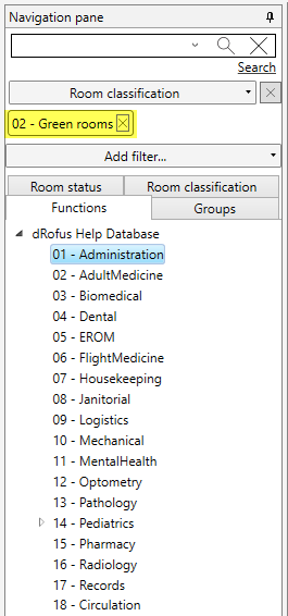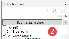 In the example above we have first selected classification; Room classification. Then set the filter to include all rooms classified as "Green rooms". The result in the navigation panel is;