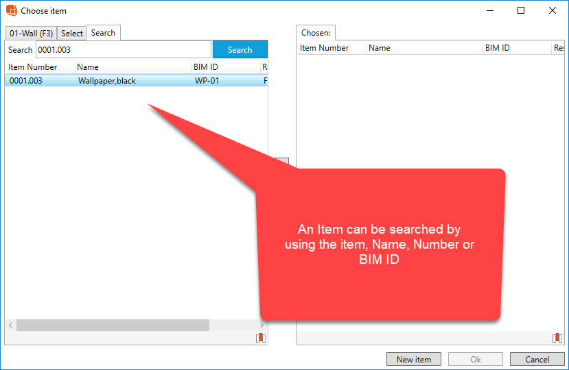 The filter will ease the process of finding the correct finishes to add. If you would like a full overview of all available items in the overview – use the Select (F3) tab or search for items using the Search tab.