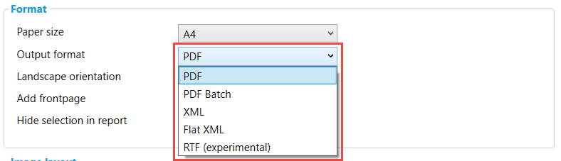 The reports can export as PDF, Batch PDF, XML, Flat XML and RTF (rich text format)