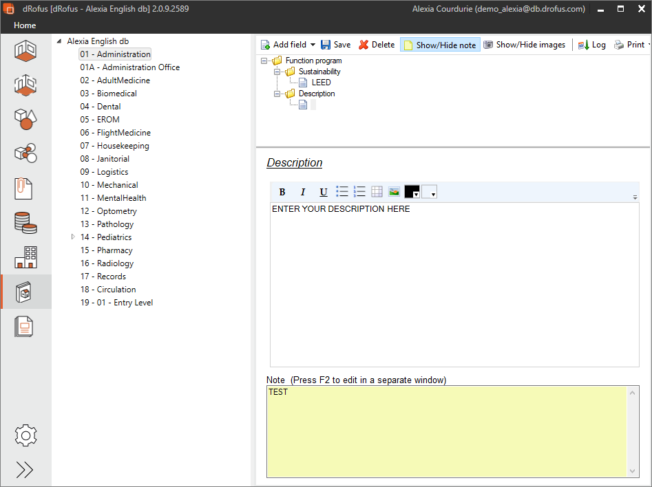 In order to work with data in the function program, you have to navigate to the field you want to change by using the tree. If the field is a text field, you will then have all the space available to edit data. You can also use the toolbar, and click on "Show/Hide note" and "Show/Hide pictures" in order to change or add notes or pictures. Any fields which have notes or pictures will then be specified as such in the tree.