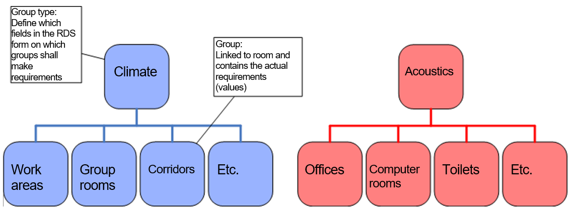 The disadvantage (and advantage) with room templates is that they apply for all Room Data fields to be set for a room. In a project, it is not uncommon to have several room templates for the different offices required, group rooms etc. For certain disciplines or fields in the Room Data form, this may represent an unnecessary division and requirements may only be needed for certain fields, but which should also apply for numerous rooms within the project. The number of rooms which should naturally have the same requirements (belong to the same group) may also vary according to the relevant fields.