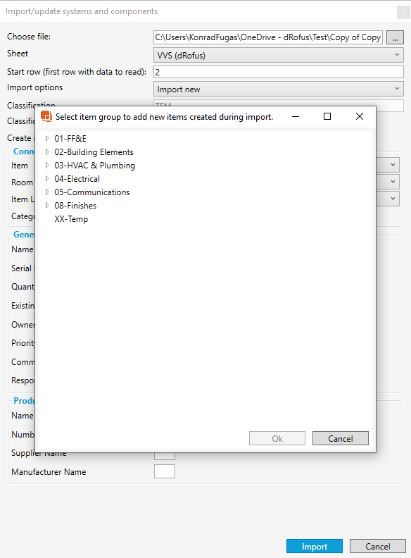 Items can be either already existing, or you can create new Items in dRofus if you check Create Items checkbox.