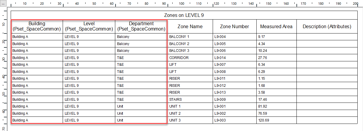 You need to identify the Zone properties within ArchiCAD which contain Functions / Sub Functions information. In the following example, for Zones on LEVEL 9, the ArchiCAD IFC property called "Building" is used to define the 1st Function tier, "Level" as the 2nd Function tier and "Department" as the 3rd Function tier (highlighted below):