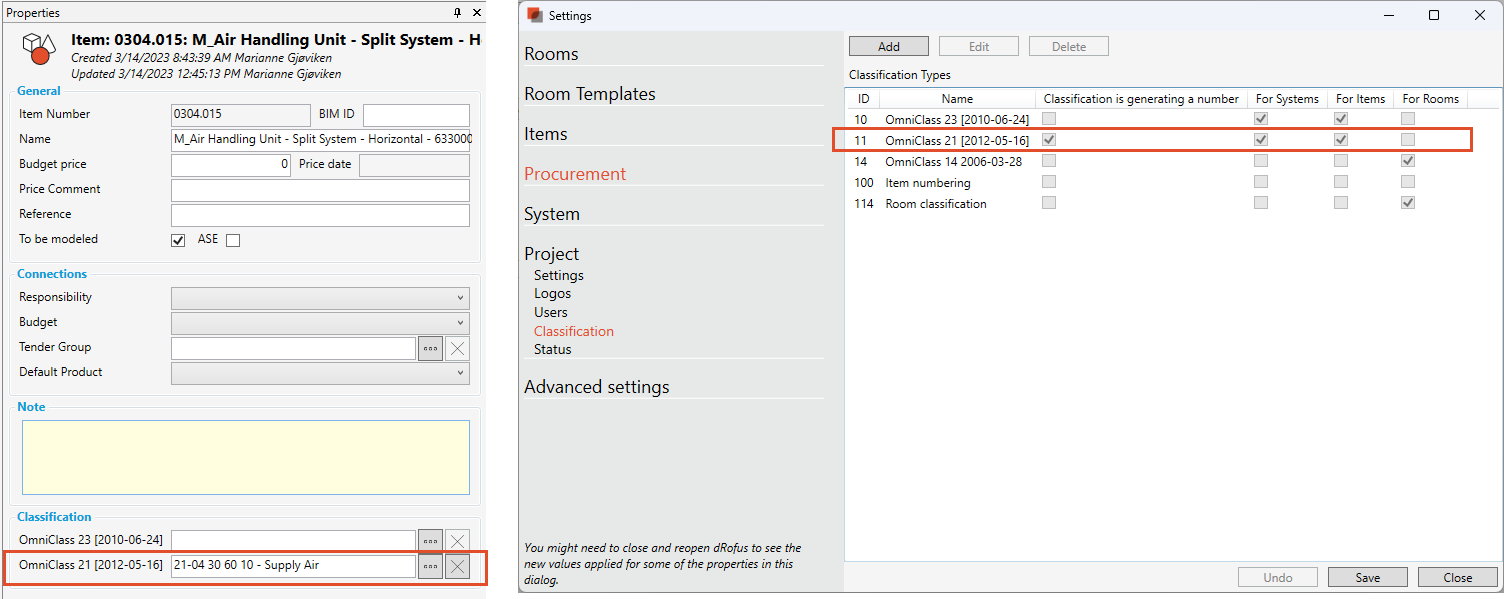 Add number giving classification to the Item in dRofus that are linked to be used as the System Component