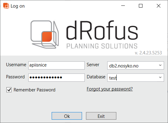 dRofus applications, both web and desktop, require a logged in user. At login, username, password and project selection is required. Project selection consists of selecting server, database and project (if multiple configured in a database).
