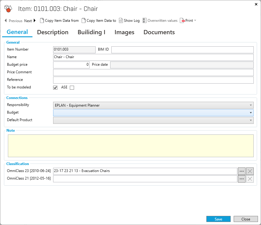 Images and Documents: Add or view images and documents connected to the Item
