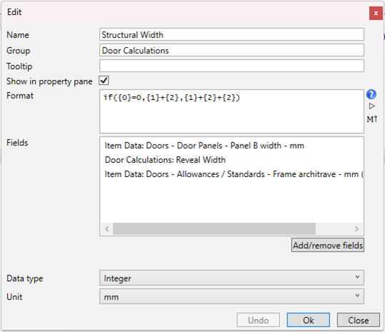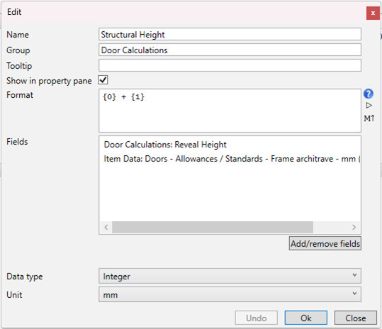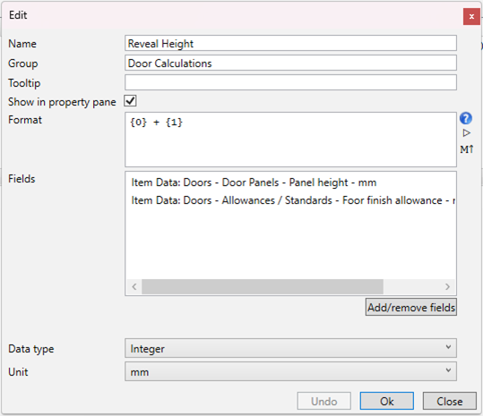 Structural Height is defined using simple addition. The Reveal Height is added to the Frame architrave. But where is the Reveal Height coming from? That is another calculated attribute. Yes, you can build formulas on top of other formulas.