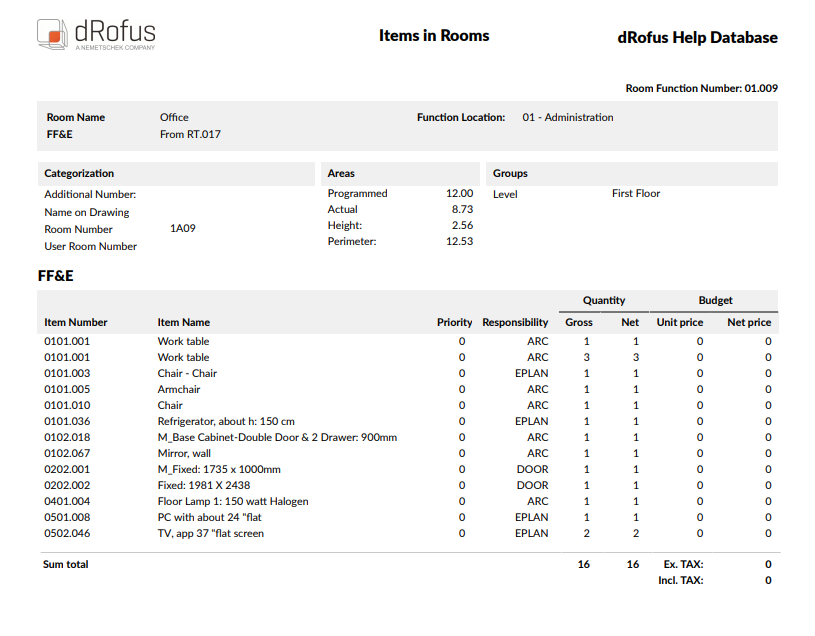 The Items in Room report output shows a list of items in the predefined Room (01.009)