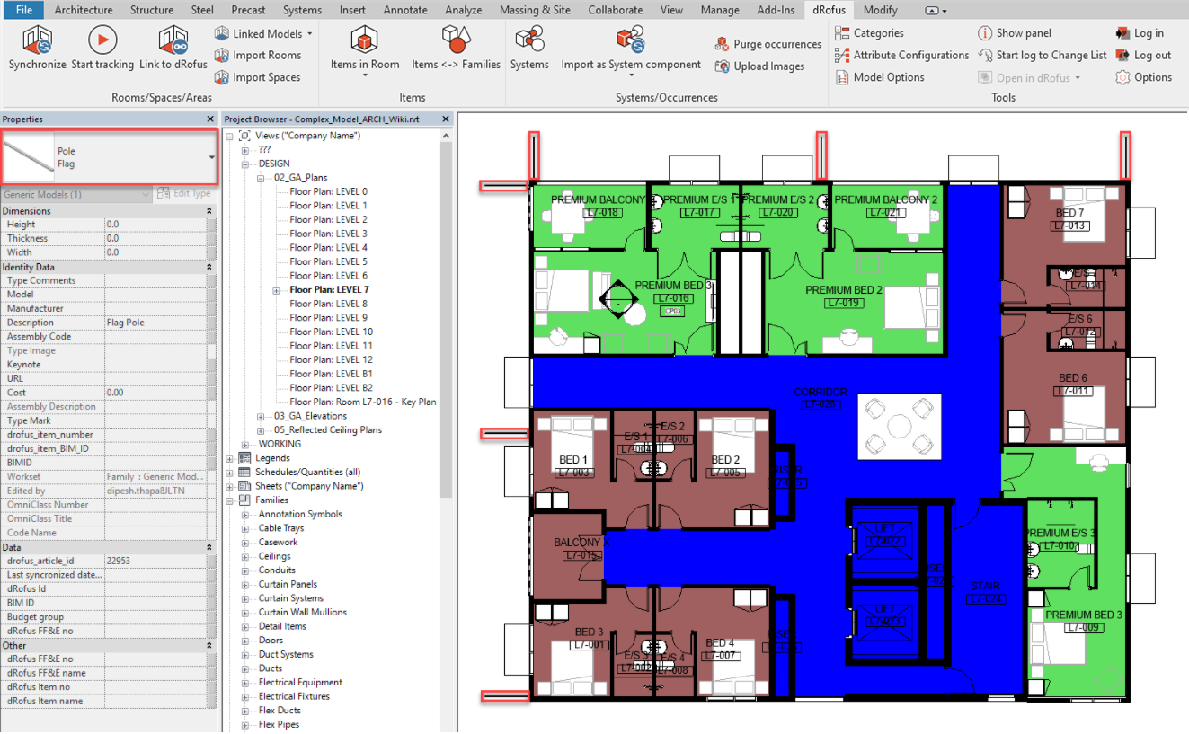 If you then go to dRofus > Items, you will note that 6 x non-Room bound Occurrences of the Flag Pole have been created as follows: