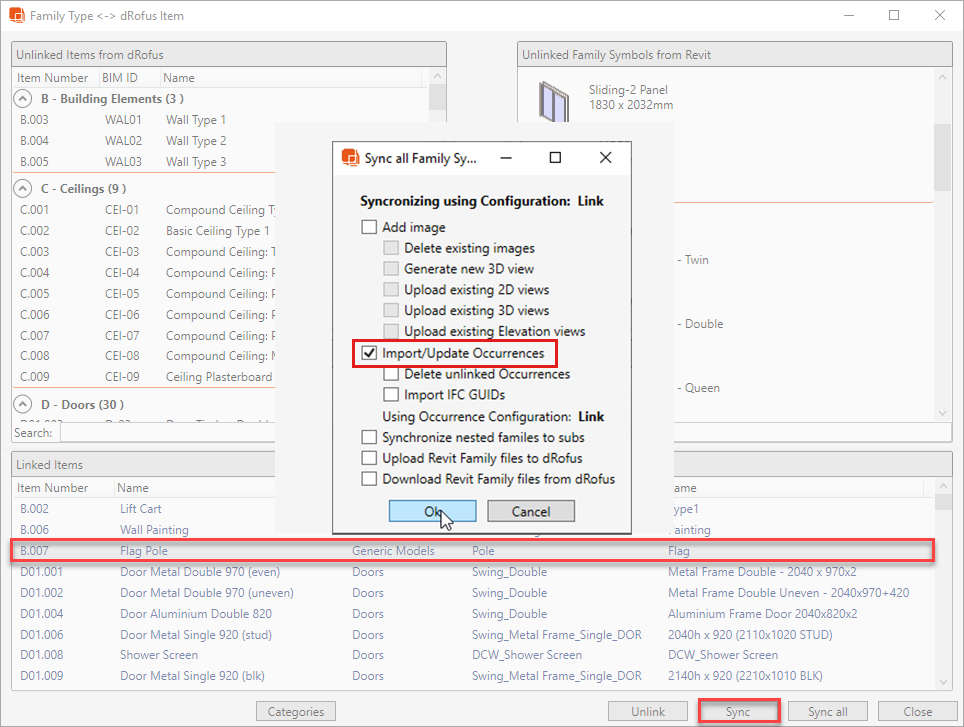 Given that the Family Type (that represents the Flag Poles) has already been linked to a corresponding dRofus Item, when running a Synchronization for that Item, if you select "Import/Update Occurrences" as follows: