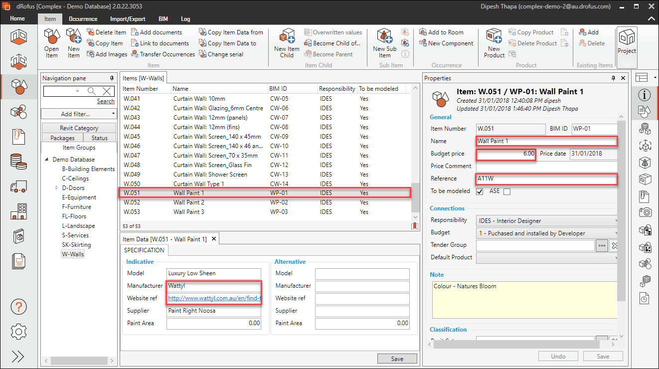 If you haven't already done so, you can now start to input some data within dRofus for your Finishes Item(s), say "Wall Paint 1".